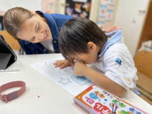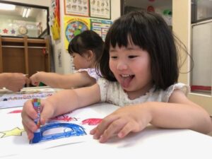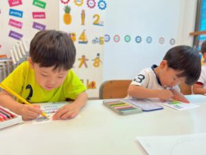 園児クラスでは、さまざまなデザインのカードの中から、好きなデザインを選び、お父さんや家族の好きな色で塗ったり、感謝の気持ちを込めて短いメッセージを書きました!