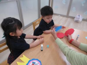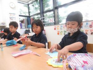 切ったり貼ったりしながら作ったメダルに、首から下げられるようにリボンを通すときには、小さな穴に子どもたちはとても苦戦しながらも、一生懸命頑張っていました。できたときには、『I did it!』と誇らしげな達成感に満ちた顔を見ることができました!