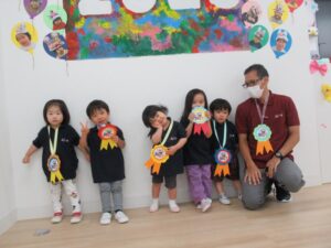お仕事から帰ってきたお父さんやご家族に、それぞれがきちんとメダルをかけてあげることができたようです。お父さんやご家族が喜んでくれたときのその笑顔や情景が、子どもたちの中で大切な思い出や達成感、喜びとなって心の成長に繋がっていくのですね。