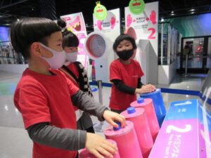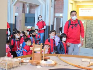 普段は同じクラスの同じ年のお友だちとの関わりが多いですが、遠足の日は、年長クラスの子どもは未就園児クラスの子どもたちと、年中クラスの子どもたちは年少クラスの子どもたちと手をつないで、館内を見て回りました。