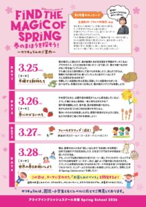 アライブでは、3月25日(水)~28日(土)の4日間、「スプリングスクール2026」を開催します。