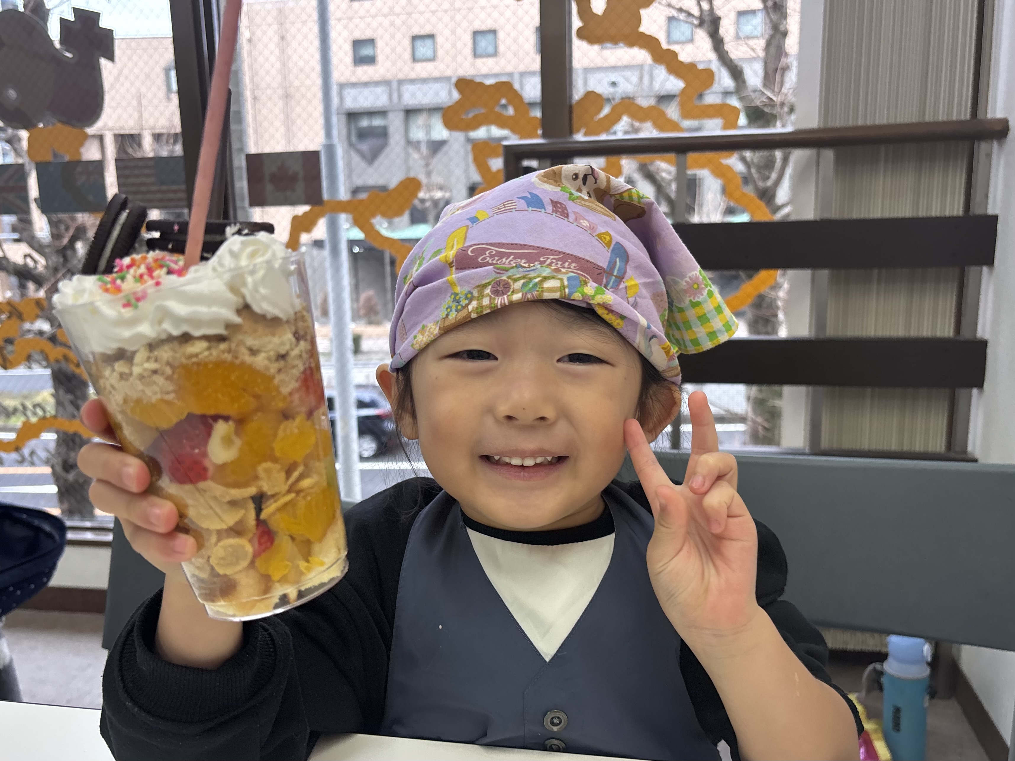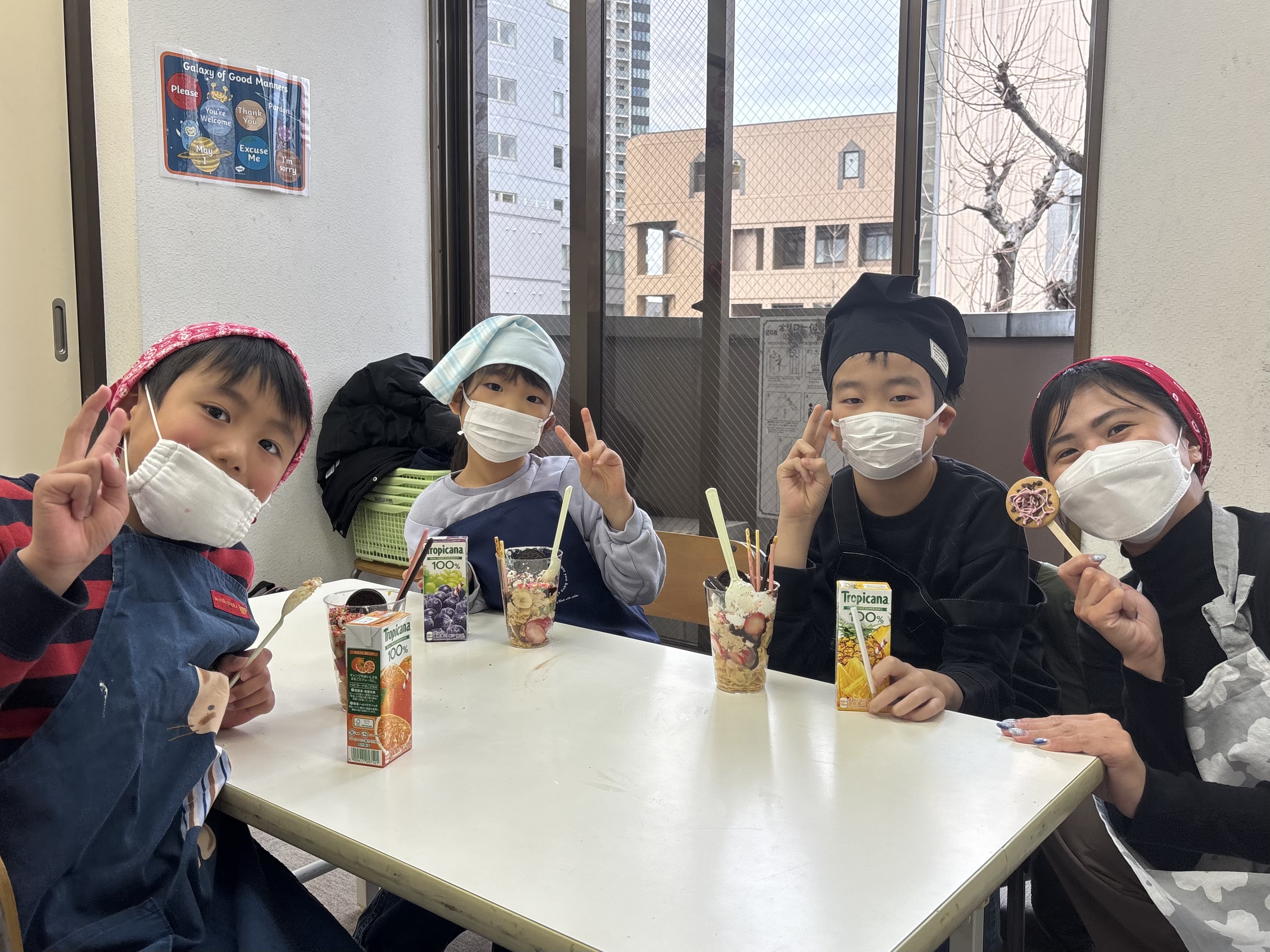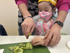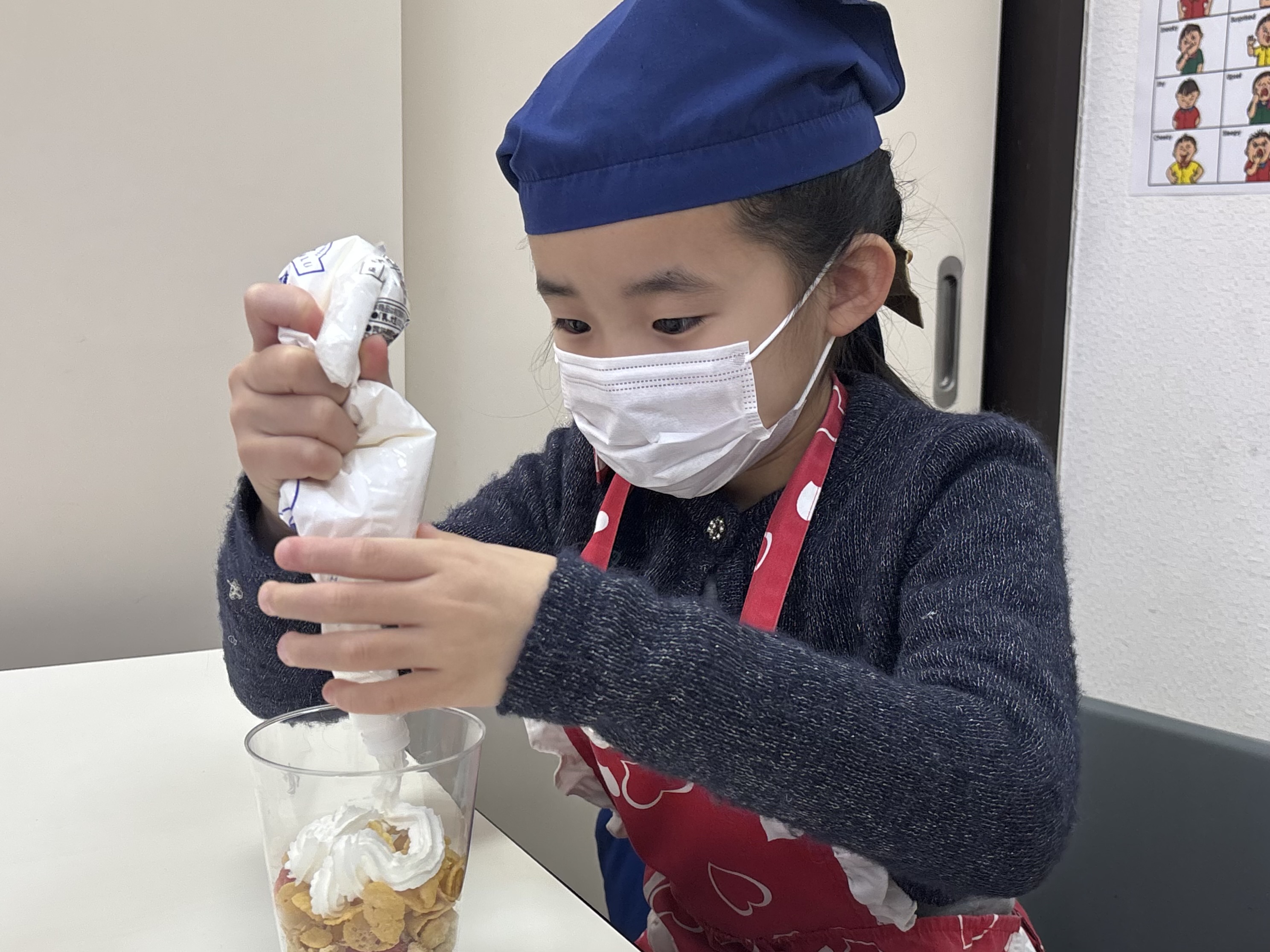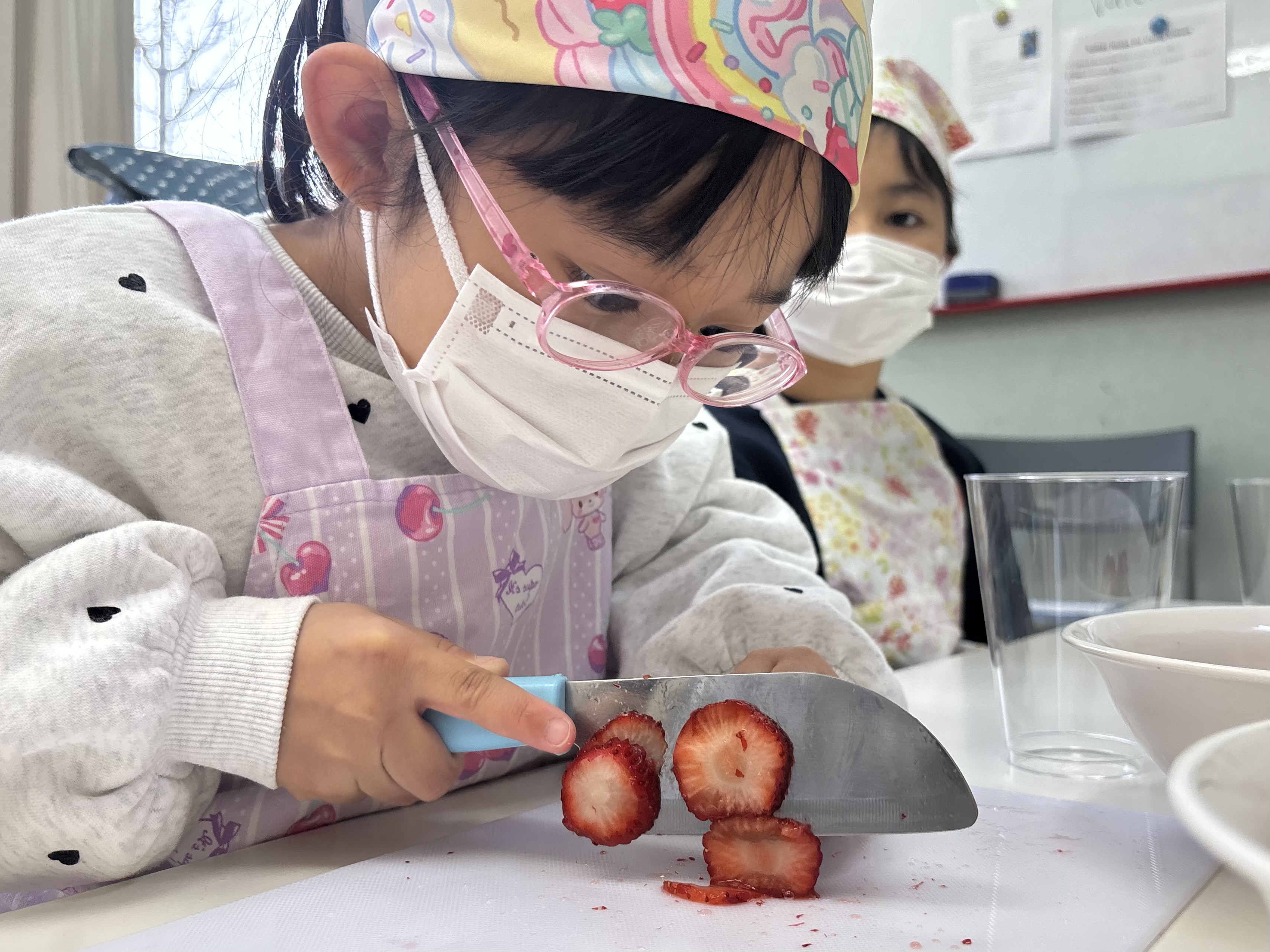 パフェ作りでは、包丁を使ってバナナやイチゴなどのフルーツを切ったり、ビスケットを砕いたりすることにも挑戦しました。