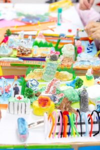スプリングスクールでは、毎日創作活動だけに取り組んだわけではなく、朝から午後のはじめにかけて、英語を使って、コミュニティーの役割や課題を学んだり、アイディアを出し合ってディスカッションしていました。(英語の学習もばっちりしています!)そして、最後の短い時間で、こんな素敵なまちを完成させました。
