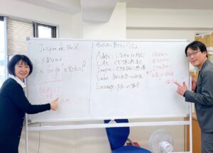 まずは、大切にしたい「心」をブレインストーミング。常に前へ進もうとする「探究心」や「チャレンジ精神」という言葉が多く挙がりました。Boo Boo 先生と中山先生は意気投合!