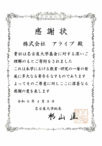 そこで、名古屋大学基金に先日寄付を行いましたところ、表彰状をいただき、アライブの外国人講師たちもとても喜んでくれました!