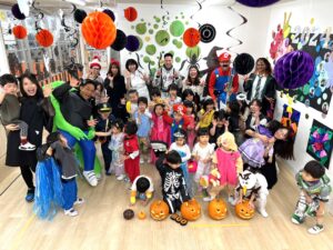 インターナショナルスクールでは、ファッションショーやゲーム、ジャックオーランタン作り、トリックオアトリートなど、子どもたちだけでなく、先生やスタッフもみんなで楽しみました!トリックオアトリートでは、子どもたちはまちを歩き、近所の自転車屋さんにお菓子をいただきました!