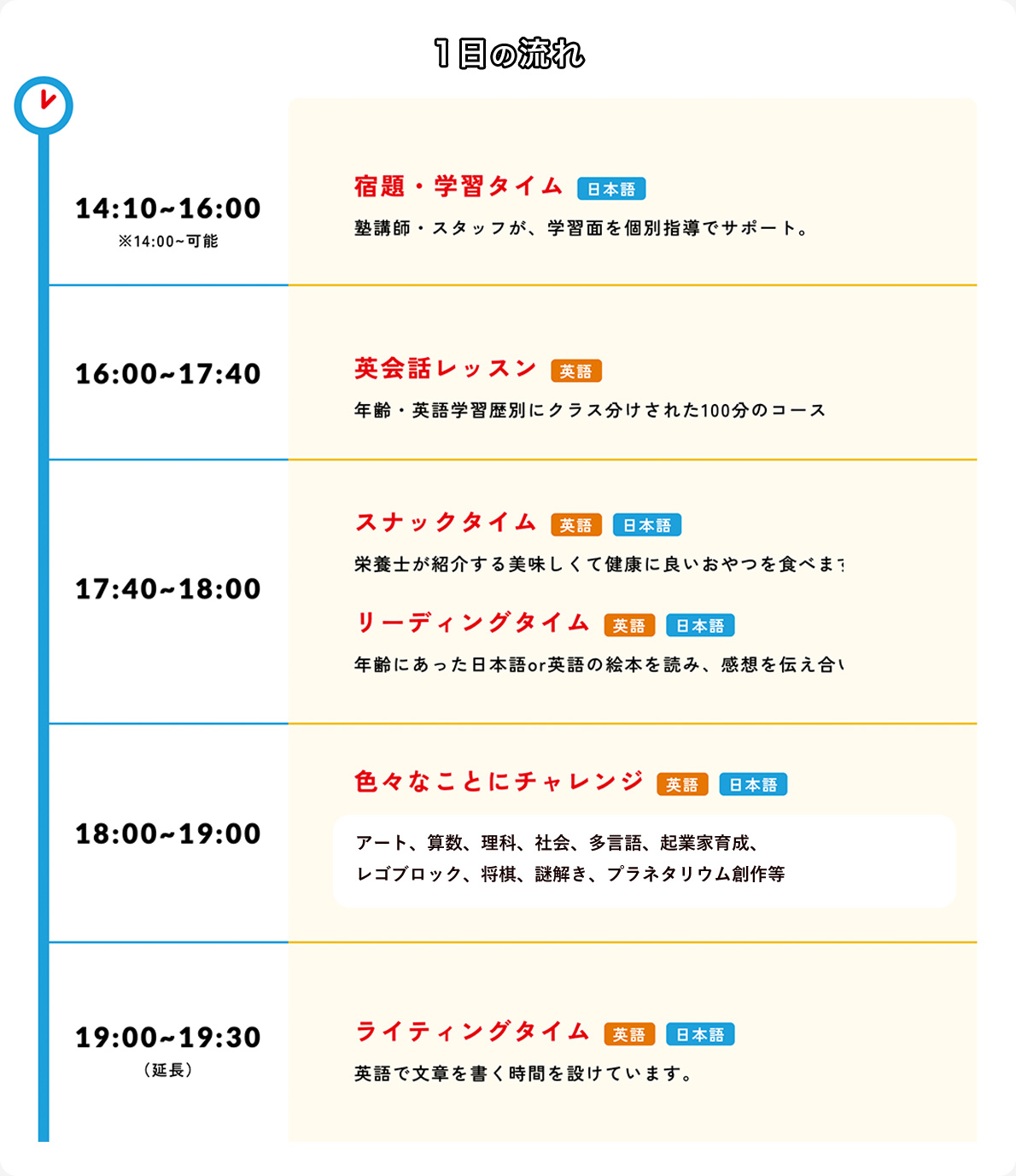 宿題や試験のサポート(日本語)に加え、英語で様々なことににチャレンジする探究活動が充実。